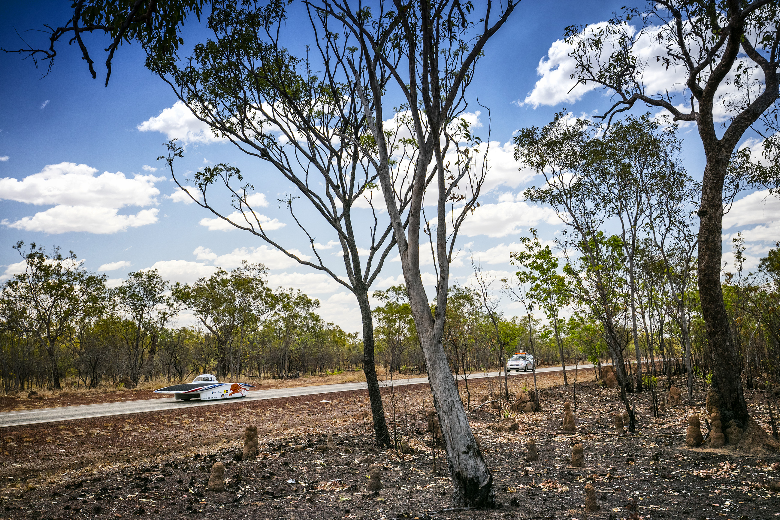 Het Nuon Solar Team startte zondagochtend in het Australische Darwin op de achttiende plek. Coureur Tim van Leeuwen haalde maar liefst elf auto’s in en kwam als vijfde aan bij de eerste tussenstop. Het rijden werd bemoeilijkt door de bermbranden, een bekend verschijnsel in het warme en droge Australië. De rook heeft effect op de hoeveelheid energie die het zonnepaneel van de auto kan opnemen. Daarom moet de coureur goed op de racesnelheid passen om te voorkomen dat de accu te snel leeg raakt.